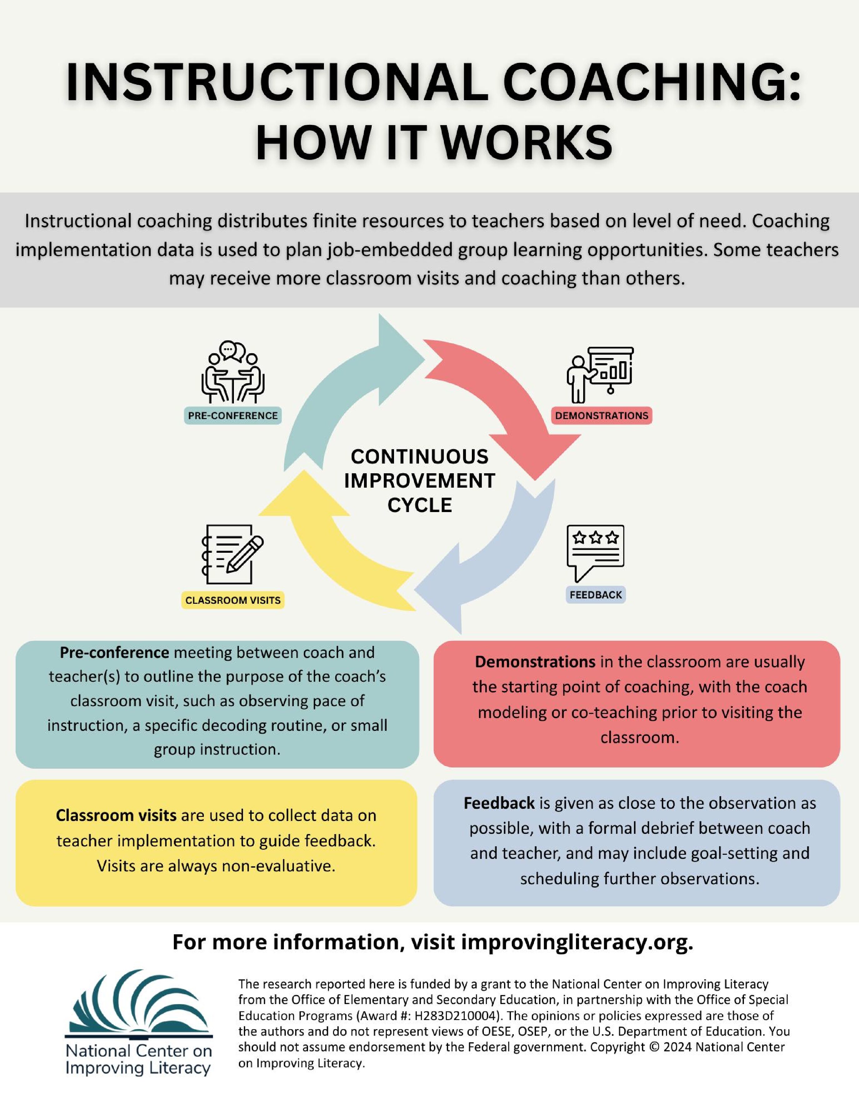 National Center on Improving Literacy (2024). Instructional Coaching. Washington, DC: U.S. Department of Education, Office of Elementary and Secondary Education, Office of Special Education Programs, National Center on Improving Literacy. Retrieved from https://improvingliteracy.org