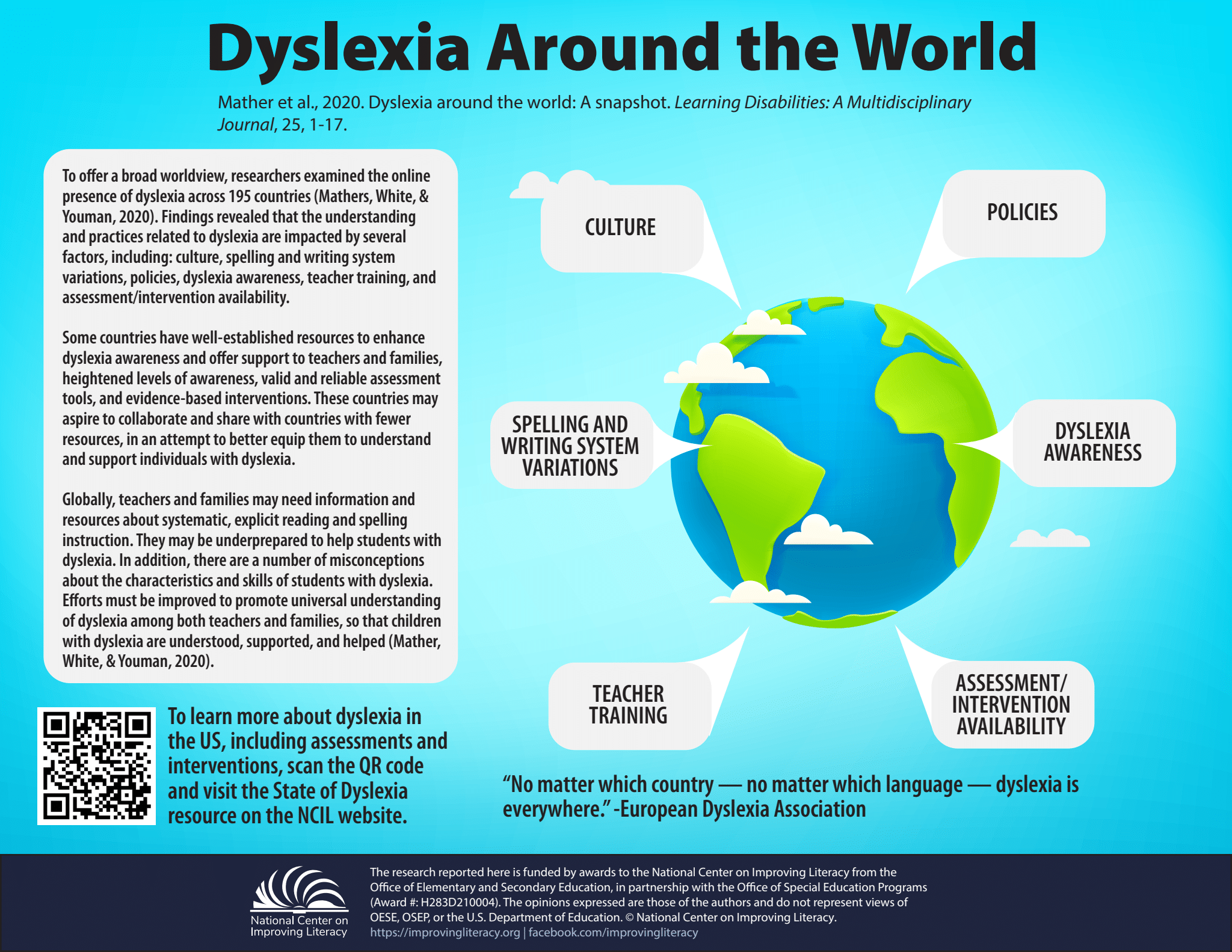 To offer a broad worldview, researchers examined the online presence of dyslexia across 195 countries (Mathers, White, & Youman, 2020). Findings revealed that the understanding and practices related to dyslexia are impacted by several factors, including: culture, spelling and writing system variations, policies, dyslexia awareness, teacher training, and assessment/intervention availability.