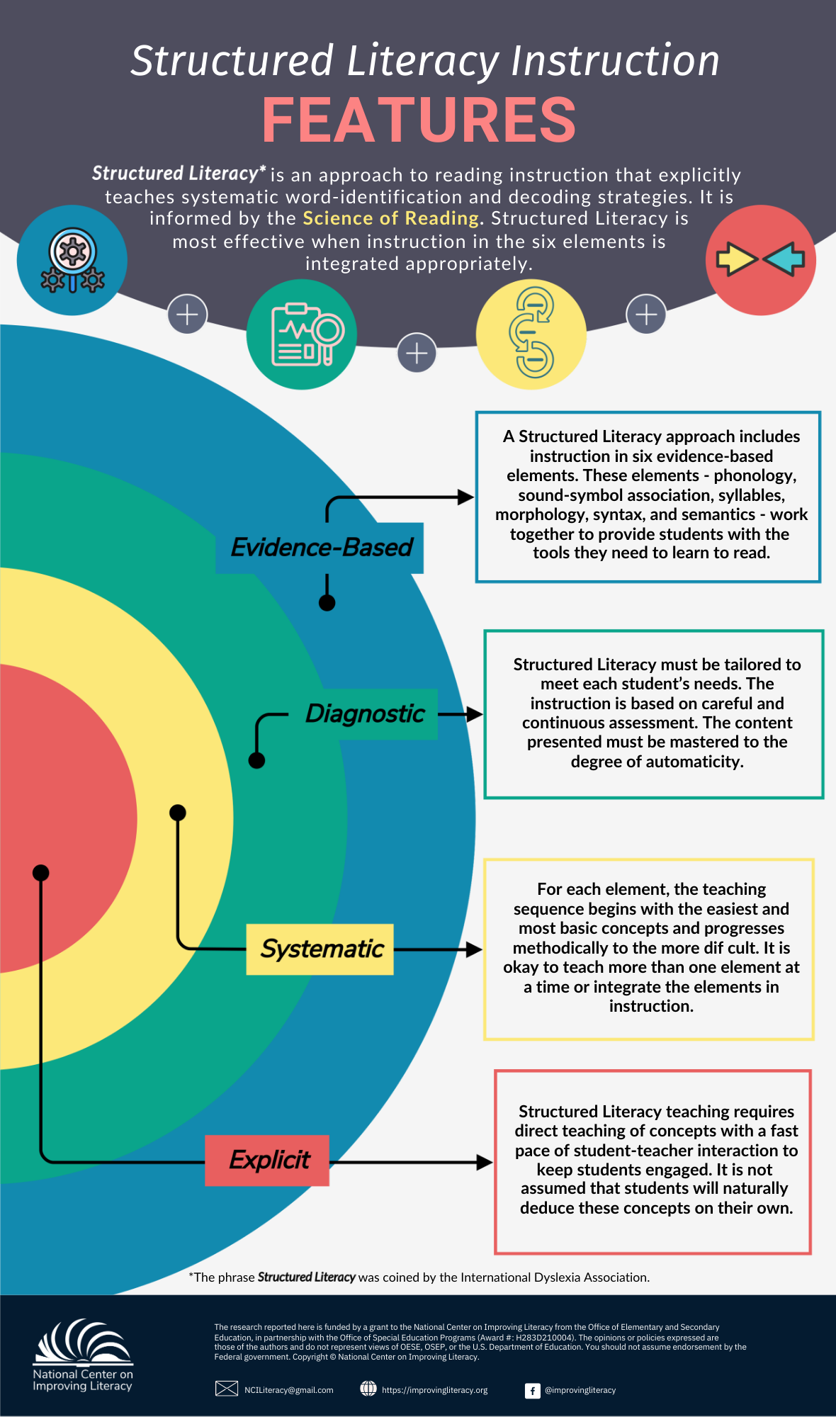 - EVIDENCE-BASED: A Structured Literacy approach includes instruction in six evidence-based elements. These elements — phonology, sound-symbol association, syllables, morphology, syntax, and semantics — work together to provide students with the tools they need to learn to read.