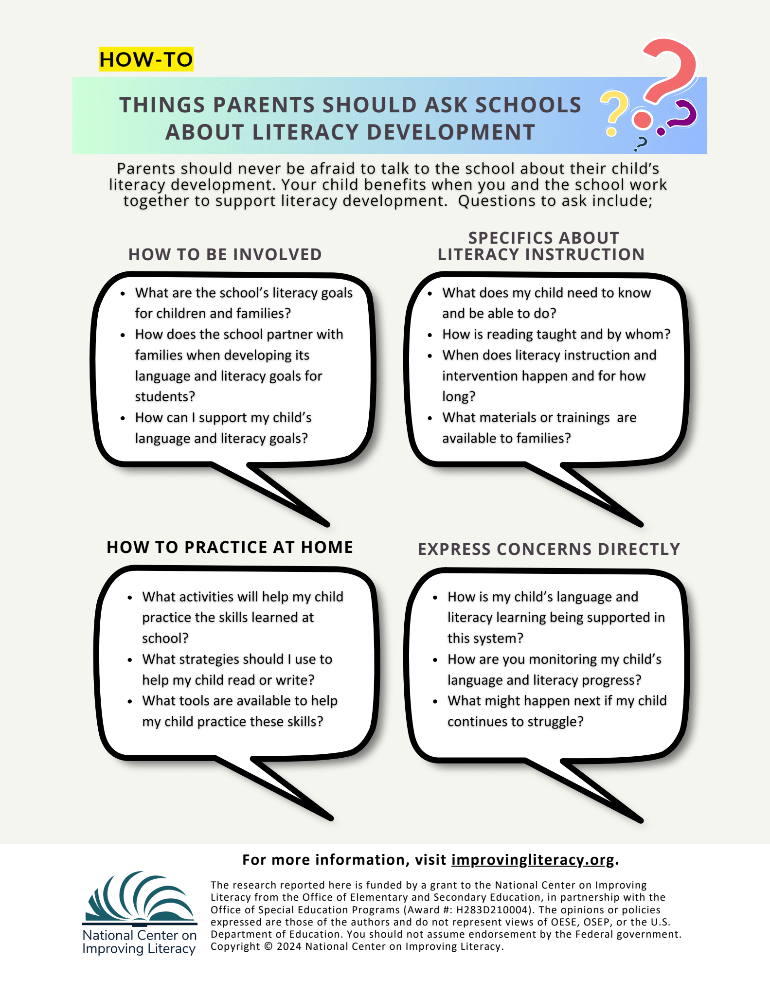 Families should understand the literacy standards a child is working on at school. Review the literacy expectations set for the child and make sure they are appropriate. Ask if the literacy instruction and intervention is evidence-based and check if the instruction and intervention target the skills the child needs most.