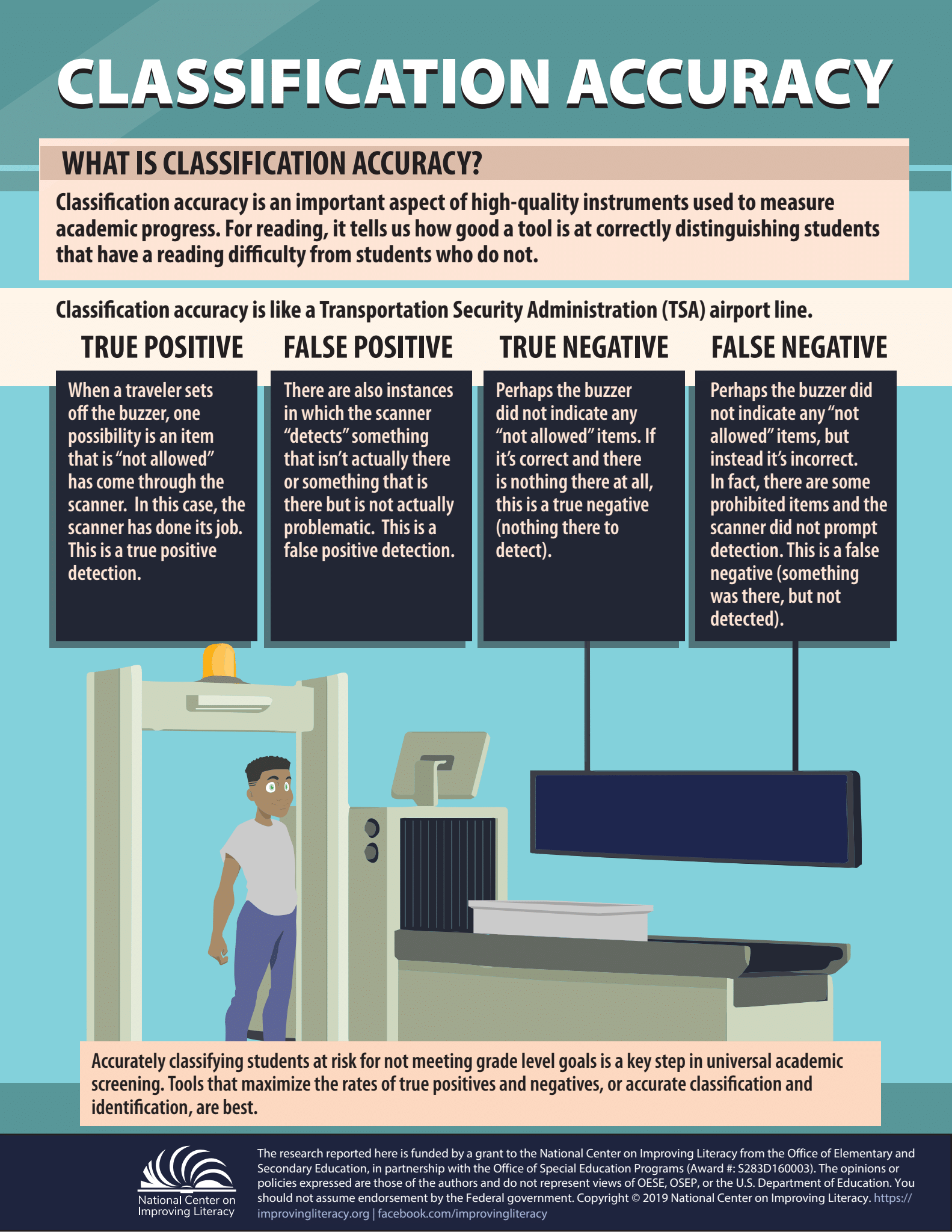 A similar accuracy is important with instruments used to measure academic progress. Classifying students is a key step in universal screening, an assessment process that helps educators identify students who are at risk for not meeting grade-level learning goals. The aim is to have tools which permit accurate classification and identification. It is very important to: