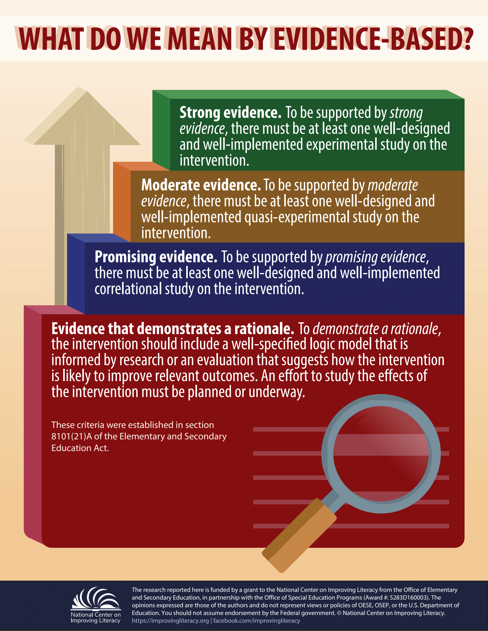 National Center on Improving Literacy. (2018). What Do We Mean by Evidence-Based Literacy Resources?  https://www.improvingliteracy.org/resource/what-do-we-mean-by-evidence-based-literacy-resources